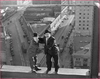 Auf einen Stahlgerüst, 100 Meter über der Straße, wechseln Laurel & Hardy die Hosen.